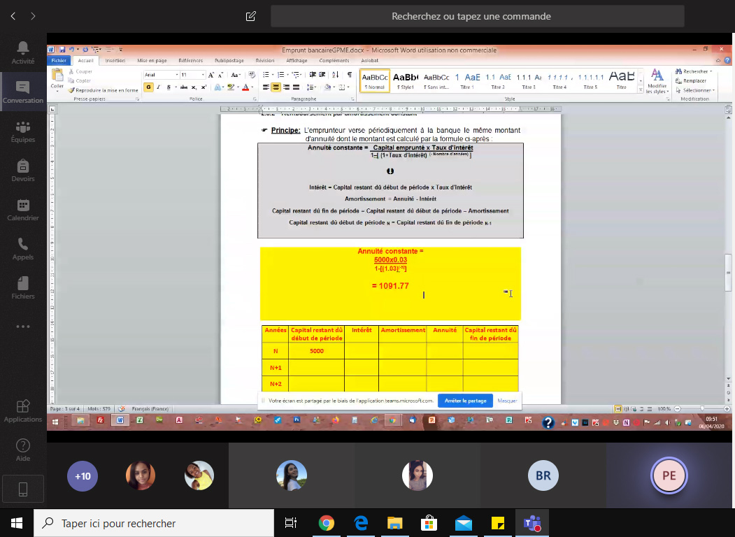 Nous avons suivi une formation pour utiliser Microsoft Teams, outil via lequel nous dispensons les cours à distance. Au préalable de chaque cours, j’envoie le contenu que nous allons travailler afin que les étudiants en prennent connaissance. A la fin du cours, je leur envoie les supports avec les exercices corrigés. Durant le cours en ligne, je partage mon écran avec la classe. J’écris en direct un certain nombre d’informations, cela remplace l’écriture au tableau. Je propose également aux étudiants de réaliser des exercices en autonomie pendant le cours. Puis, nous mettons en commun pour corriger.